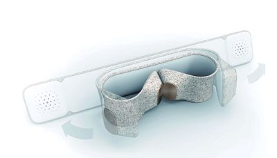 这是一款把耳机和扬声器结合在一起的“发卡”,内置蓝牙系统,可以和智能设备进行连接。作为耳机,它采用后头戴式的设计,保证了舒适性。而充当扬声器时,只要将智能设备放置在扬声器口的中间部分即可。