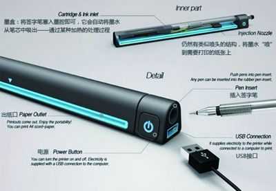 这款由设计师Tae-jin Kim和Su-in Kim设计的简易打印机,墨水来源于未彻底使用完的签字笔残余墨水。将留有墨水的签字笔插入打印机侧面的小孔中,打印机可以将内部的残留墨水全部抽出,再将打印机连接在电脑上即可使用。