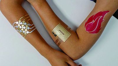 麻省理工学院和微软研究院联合开发出了一种暂时性的可穿戴纹身产品——DuoSkin。和其他暂时性纹身一样,产品采用金叶和LED为材料,但比其他纹身更像精美首饰。DuoSkin主要有3种用途:输入装置, 控制智能手机应用;输出装置,可当作显示屏使用;连接装置,利用NFC技术传送数据到其他设备。