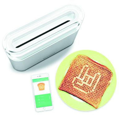 这款智能烤面包机T o a s t e r oid,可以通过app来绘制面包上的图案。如果早上赶时间,可以在app里预设好一系列图案和信息类别;按下“天气预报”,上班路上吃面包时就可以了解当天天气状况等信息。除了在面包上“打印”需要的信息外,这台面包机还有社交功能,可以在Toasteroid 用户间互发信息,让对方的面包机把信息打印出来。