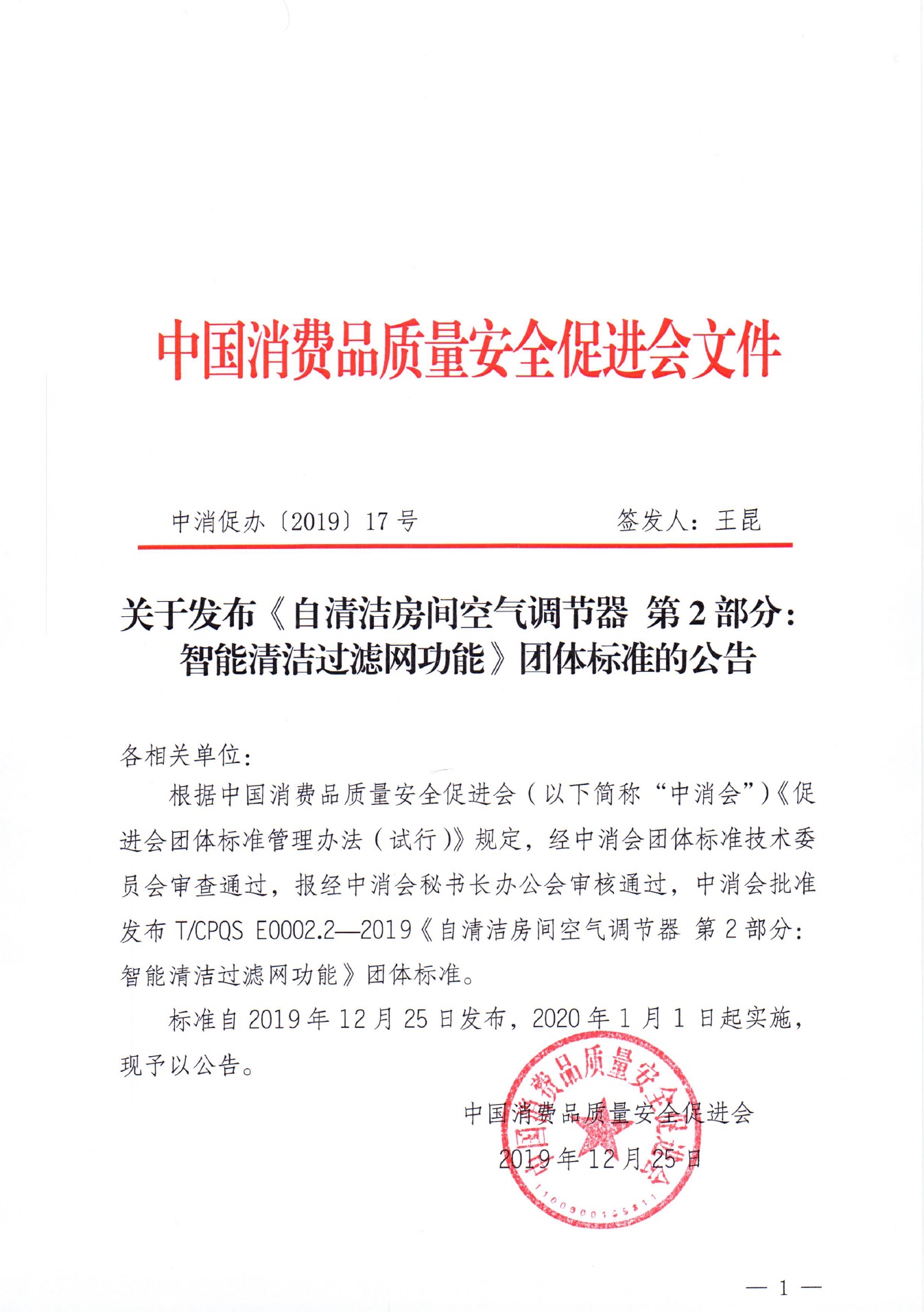 关于发布《自清洁房间空气调节器 第2部分:智能清洁过滤网功能》团体标准的公告