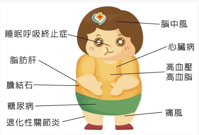 肥胖常常和血脂异常、脂肪肝、高血压、冠心病、糖耐量异常或糖尿病等疾病同时发生,还可伴随或并发睡眠中阻塞性呼吸暂停、胆囊疾病、高尿酸血症和痛风、骨关节病、静脉血栓、生育功能受损以及某些癌症等疾病。肥胖可能是这些健康问题的诱因和危险因素,也可能与这些疾病有共同的发病基础。