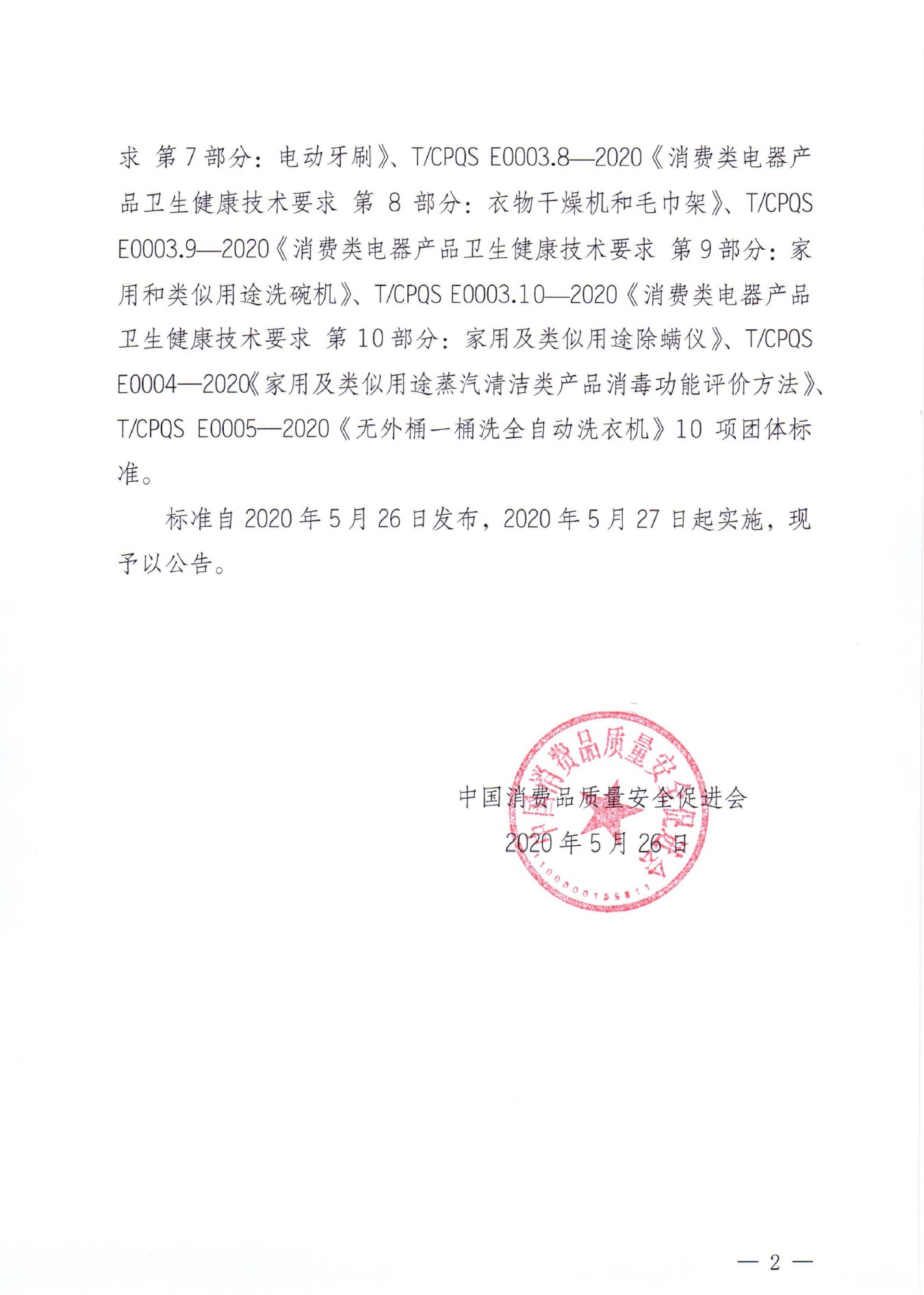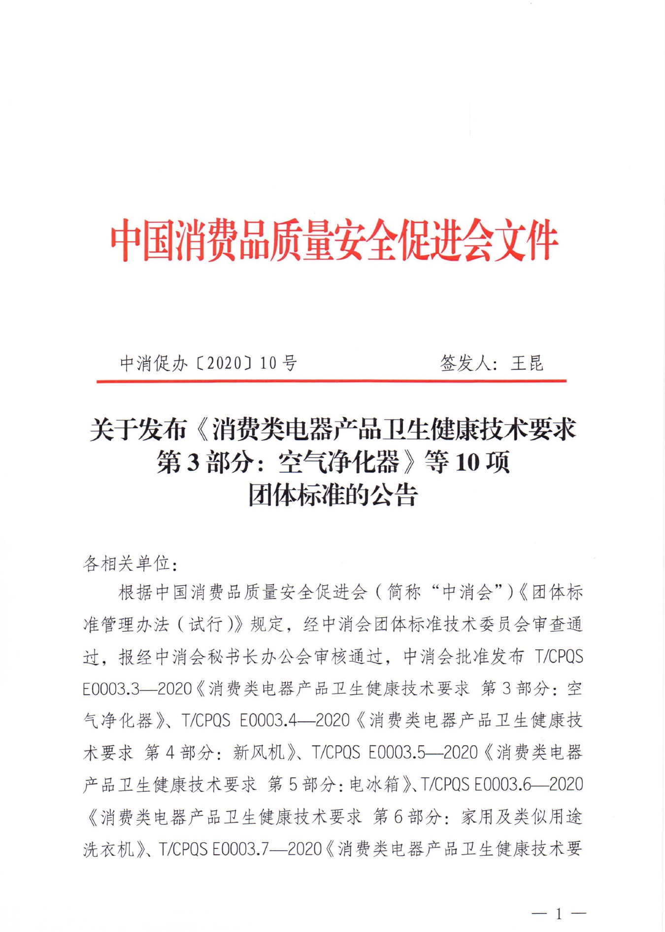 关于发布《消费类电器产品卫生健康技术要求 第3部分:空气净化器》等10项团体标准的公告