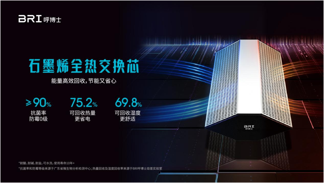 除此之外,呼博士新风采用先进的的石墨烯全热交换芯,具有超高的导热系数,抗菌防霉0级,温度交换效率高达75.2%,可大幅度降低空调负荷,远超市面上的普通新风。石墨烯使用寿命长达10年以上,且无需更换,极大降低了后期的维护成本,让家人省电更省心。