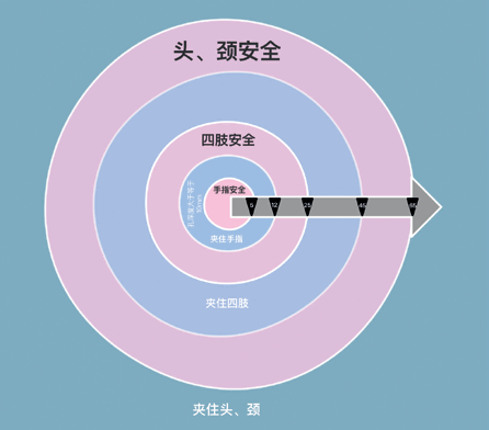 对于婴幼儿来说,手指、四肢、头颈是容易卡住而造成伤害的三大部位。婴幼儿手指直径约5mm~12 mm;四肢尺寸约25mm~45 mm;头、颈部尺寸≥65mm。当孔≤5 mm,比小手指小,是安全的;开口大小在12mm~25 mm之间,比大拇指大,比四肢小,是安全的;间隙大小在45mm~65 mm之间,比四肢大,比头颈小,是安全的。相对应的,其他的尺寸间隙,就可能会夹住手指、四肢、头或颈部。