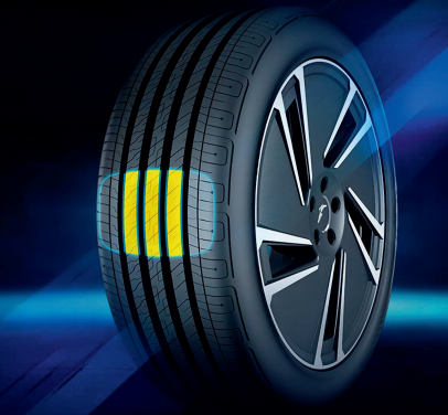 运用了高效低滚阻配方以及单层内面胶设计,保证气密性的同时,降低滚动阻力及能量消耗,有效提升续航里程。胎面采用3种橡胶高分子,提升刚性,配合高刚性中心花纹条块,提升抓地力,有效传递电动车大扭矩。外侧胎肩横沟封闭设计,阻断主沟噪声横向扩散,降低噪声产生;同时通过在轮胎内侧添加的聚氨酯泡沫隔层,有效阻隔轮胎滚动时所产生的空腔噪声。