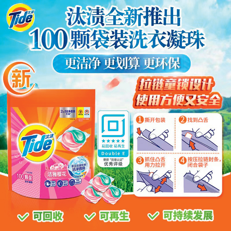 在这个战略推动下,近日,宝洁在洗衣凝珠软包装方面实现了新突破,这种新型包装不仅兼顾塑料可回收和安全 锁设计,更是基于对消费者需求的洞察,将儿童安全和可回收塑料完美结合。