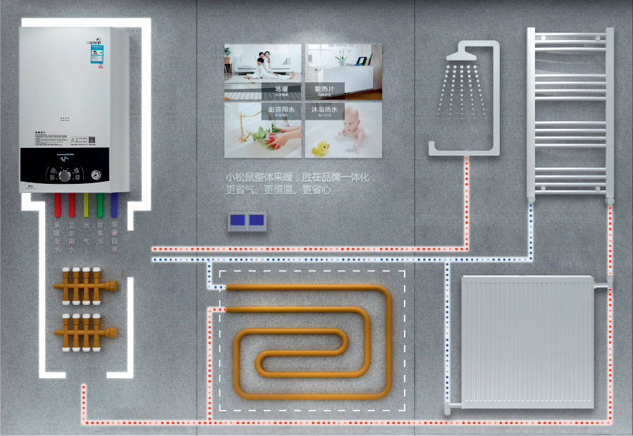 壁挂炉可以满足采暖、热水两用,当采暖功能启动,开机自检之后,水泵运转,风机启动,比例阀按需提供燃气,点火加热,采暖热水输出,传送至散热末端(地暖或者散热片),为用户提供温暖舒适的生活环境。当打开水龙头或花洒使用热水时,三通阀暂停供暖热水,将高温水切换至副热交换器,与自来水进行换热,根据设定温度,通过“水气双调”,提供高精度控温的恒温舒适热水。在副热交换器中生活用水与壁挂炉内循环加热的采暖用水各自有各自的通道,不会混合,等生活用水使用完之后,壁挂炉会自动恢复到采暖运行状态。