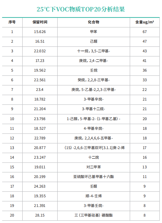 从上述分析可见,在针对汽车零部件材料进行气味排查时,温度是一个非常重要的考察因素。一方面要考虑不同温度下化合物释放的种类差异和量值差异,针对室温车内气味的改善还是建议对内饰件和材料的筛选使用与整车保持一致的常温气味物质采集;另一方面也要关注由于温度升高引起的大量烷类物质的释放,覆盖了其他浓度不高但气味强度高的化合物在谱图上的呈现。此外,由于原料、工艺差异,同类零部件的气味物质和气味特性也存在明显的差异,我们在查找化合物时,还需要充分考虑不同化合物浓度与气味强度贡献度,以及化合物与材料气味类型匹配度,确保目标化合物能有效识别并进行有针对性改善,最终达到对气味的合理管控与有效整改。