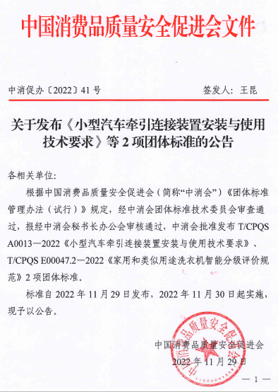 2022年11月29日,根据beat365官方网站,beat·365,beat·365官方网站,beats365唯一官网入口(简称“中消会”)《团体标准管理办法(试行)》规定,经中消会团体标准技术委员会审查通过,报经中消会秘书长办公会审核通过,中消会批准发布T/CPQS A0013—2022《小型汽车牵引连接装置安装与使用技术要求》团体标准,自2022年11月30日起正式实施。