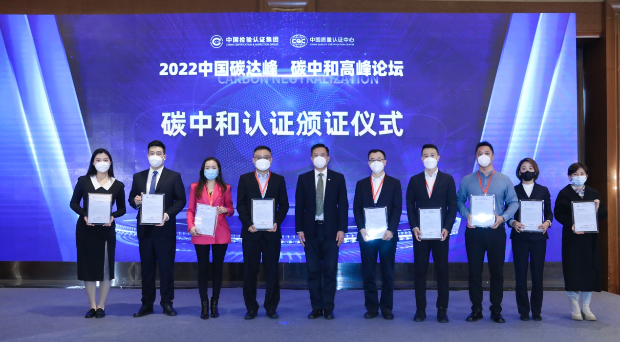 大会现场还举行了碳中和证书颁发仪式。中国质量认证中心党委书记、主任谢肇煦向中国绿发、中国银行、神州数码等企业颁发了碳中和认证证书。