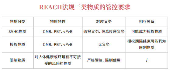 同时,REACH法规把管控的物质也分为三类。第一类是授权物质,授权物质是从SVHC中挑选出经官方授权许可后能投放市场及使用的物质,授权物质清单列于REACH法规附录VIX。
