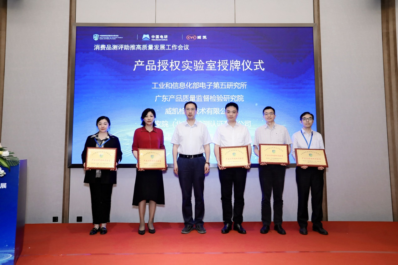 会上,王昆秘书长为工业和信息化部电子第五研究所、广东产品质量监督检验研究院、德凯质量认证(上海)有限公司、中家院(北京)检测认证有限公司、威凯检测技术有限公司等中消会首批签约的“产品测评授权实验室”进行现场授牌。