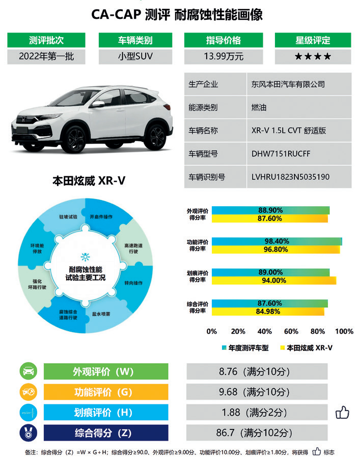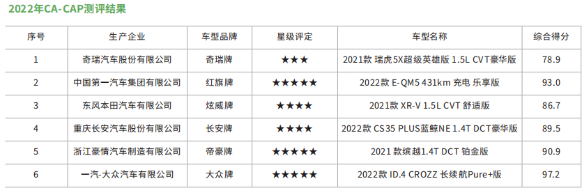 2022年,CA-CAP测评正式启动,CA-CAP工作组按管理办法要求,抽取了奇瑞瑞虎5X、红旗E-QM5、长安CS35 PLUS、吉利缤越、大众ID.4CROZZ、东风本田XR-V等6款车型进行测评,历经一系列专业的测试、严格的评审,最终确定6款车型的综合测评结果。