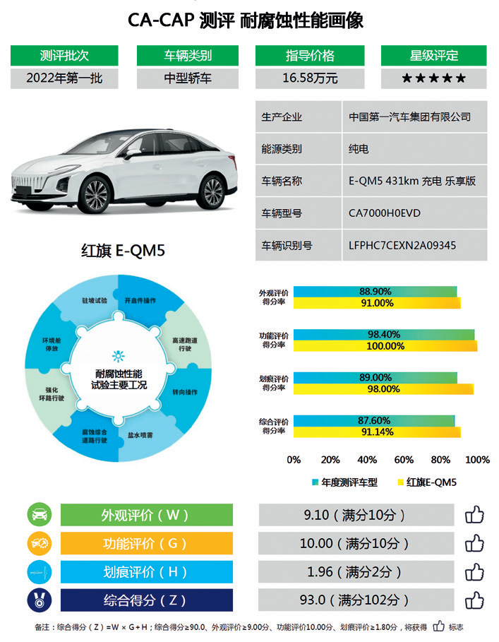 本次会上发布了6款市场热门车型的测评结果,涵盖了轿车、SUV、自主、合资、燃油、电动等多类型车型。其中自主品牌车型4款、合资品牌车型2款,燃油车4款、电动车2款。从测评结果来看,首批测评的6款车型中,红旗E -QM5、吉利缤越和大众ID.4CROZZ以其优秀的耐腐蚀性能脱颖而出,获得耐腐蚀性能测评5星级,并荣获国内首批耐腐蚀性能测评“白金等级”认证。