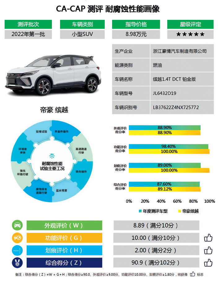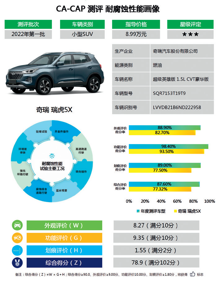 功能评价得分也是一级指标。腐蚀会导致汽车功能失效,引发严重安全性能故障,缩短汽车使用寿命。本轮测评车型功能评价得分整体上处于优良水平,但有两款测评车型因出现功能故障被扣分,因此仍需警惕腐蚀对汽车功能造成的影响。