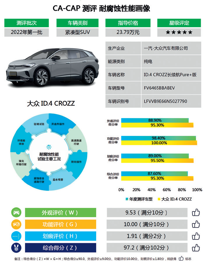 在CA-CAP规则中,外观评价得分列为一级指标。汽车外观作为可见度相对较高的区域,用户对车辆外观腐蚀十分敏感,汽车腐蚀投诉也主要集中于此。本轮6款测评车辆外观整体表现尚好,外观得分差异主要是由于各车型高可见区域耐腐蚀性能不同。大众ID.4外观得分9.53分,位列本次外观得分项第一,红旗E-QM5以外观得分9.10分紧随其后。