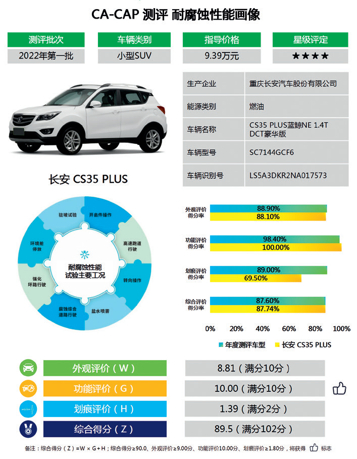 汽车的防腐体系是个复杂的系统工程,与汽车防腐的工艺设计、材料选用与生产成本的控制密切相关。汽车从设计、生产、销售、使用,到暴露出腐蚀问题,往往是3年以后甚至是更长时间,通过CA-CAP综合评价分值和星级评定,消费者在选购产品时将不再感觉迷茫,可以一目了然地了解汽车耐腐蚀性能质量分级,从而为广大消费者在产品选购时提供一个全新维度的参考指标。