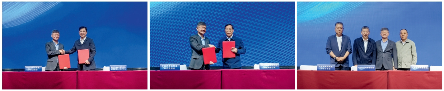 促进会与国家标准技术审评中心(左)、学习强国学习平台(中)及京津冀三地消协组织(右)分别签署战略合作协议。