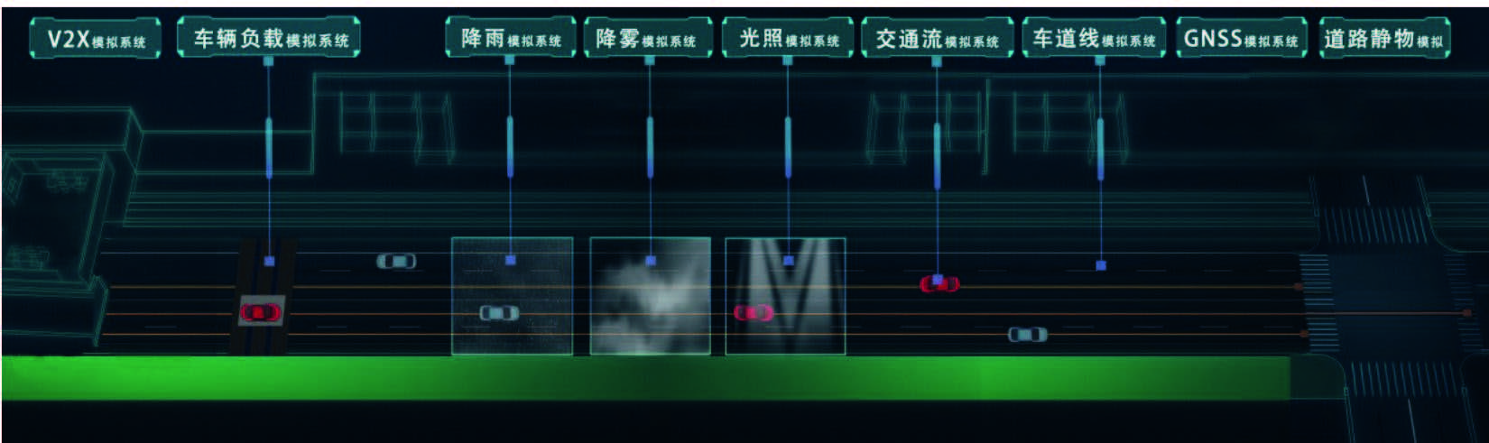 整车交通环境在环测试平台旨在模拟气候环境、还原车辆道路行驶负载及交通参与物交互行为。在实验室可控的条件下,采用物理方式实现雨雾光等气候环境的真实模拟,通过车辆负载模拟平台为测试车辆提供与道路行驶相一致的运行条件和道路载荷条件模拟。同时,利用假目标物及运动控制平台,实现交通参与者之间的相互运动,形成复杂多变的交通场景。