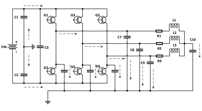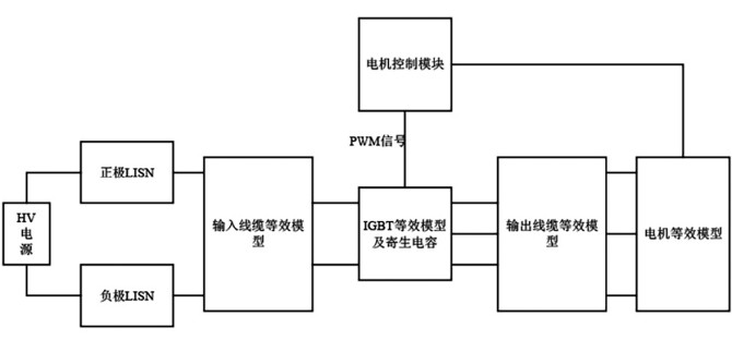 在图2中,共模干扰通过IGBT发出,经过IGBT本身、三相线缆以及电机外壳对地的寄生电容,最终传导至大地。在这个过程中,通过直流线缆侧的寄生电容返回。共模干扰的耦合路径主要集中在通过IGBT和线缆传导至电机外壳,再通过大地传回的过程。