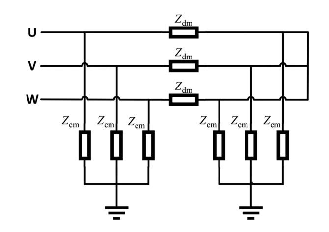 在电路理论知识中,任何一个复杂的无源线性二端口网络都可以通过三个阻抗来等效其外部特性[7]。为了对电机的内部结构进行简化,将电机的三相绕组、转子和电机外壳视为一个整体,将共模干扰和差模干扰在每相绕组中的传播路径等效为“π” 型网络,如图4所示,整个电机由三个“π”型网络构成,最终电机的三相等效“π”型网络如图5所示。在“π”型网络中,两侧为单相的共模阻抗,共模干扰通过该回路流向大地;在网络中间为差模阻抗,用于模拟绕组自身的阻抗特性,差模干扰通过该回路流向三相公共端再流入系统回路中。