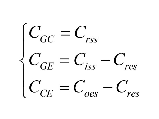 IGBT是电驱动系统中最大的干扰源。目前,在车载电驱动系统中,IGBT的工作电压等级最高能达到800V,开关频率主要集中在2kHz~20kHz,其快速开关所带来的高dv/dt会带来更加严峻的传导干扰。其自身存在的寄生参数会为传导干扰提供路径,从而传导至系统的其余部分[8]。IGBT的寄生参数主要包括内部的集电极与栅极间电容 、栅极与射极间电容以及集电极与射极间电容 与对散热器的寄生电容 ,如图6所示。目前,在IGBT生产过程中,并不会直接告知极间电容值,而是会在数据手册中标注输入电容 、输出电容和米勒电容 ,并描述上述电容与输入电压的关系[9]。