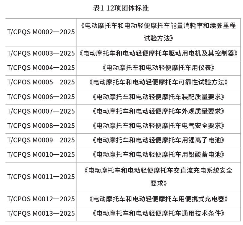 为响应“一带一路”倡议,支撑中国电动摩托车产业高质量“走出去”,中国质量认证中心组织行业内骨干企业、检测机构及科研院所,共同研制并发布了T/CPQS M0002—2025至T/CPQS M0013—2025系列团体标准,见表1。本文将从技术角度出发,详细解读该系列标准的起草背景、核心内容与实施意义,以促进其理解与应用。