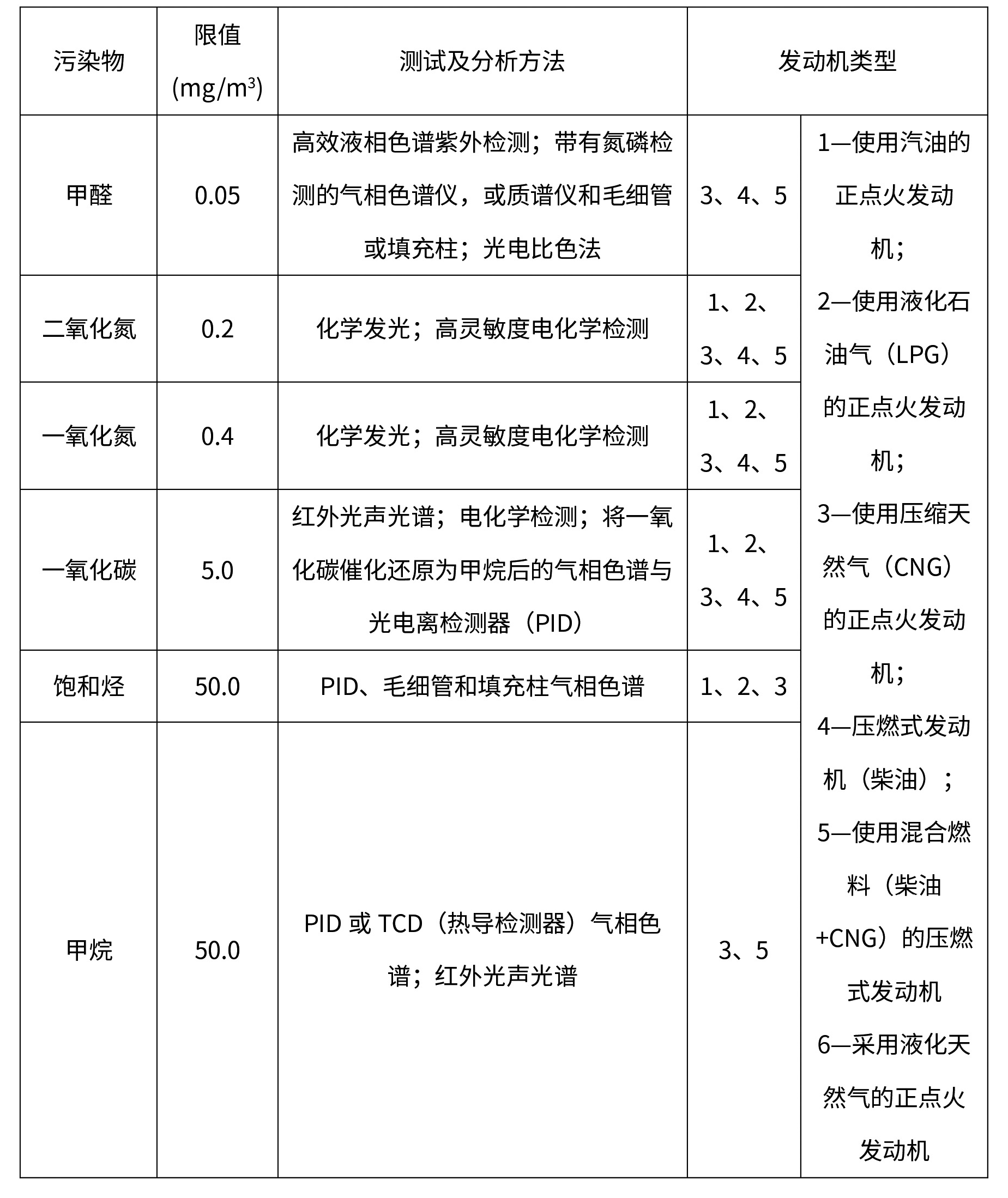 G0ST 33554关注进入车舱的废气,对于测定哪种污染物是由发动机类型来确定的。以甲醛为例,对使用压缩天然气(CNG)的正点火发动机、柴油发动机和柴油天然气的混合发动机这三种类型的车辆,要求测量车舱内甲醛浓度,其他类型车辆则不测试。对于每类污染物,标准中都给出了相应的测试分析方法。具体见表2。