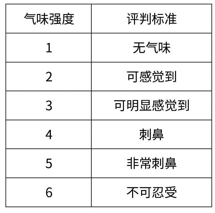 目前,主机厂在进行整车气味评价时会组织气味评价员依次进入车舱内部,对特定位置的气味进行评价,并根据主观感受给出气味强度。我国汽车行业对气味强度的评判主要分为六级,见表2。