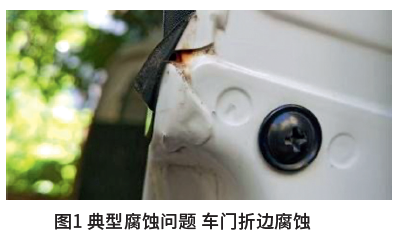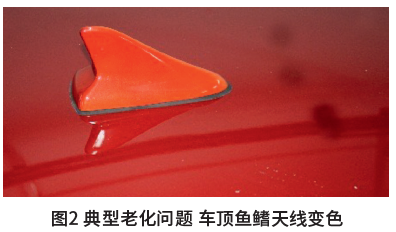 汽车车门折边因结构缝隙易积聚水分,成为腐蚀高发区,见图1。车顶鱼鳍天线等外饰件则因材质差异与热胀冷缩作用出现变色、开裂等老化现象,见图2。