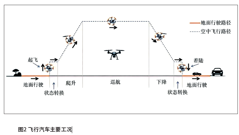电动汽车(EV)的主要工作状态分为爬坡、高速超车、怠速等,追求更加宽的调速和变矩范围。不同于EV典型工况,飞行汽车动力系统须同时满足地面行驶、垂直起降、空中悬停、巡航飞行等多场景需求,技术复杂度远高于传统交通工具[7],主要工况见图2。
