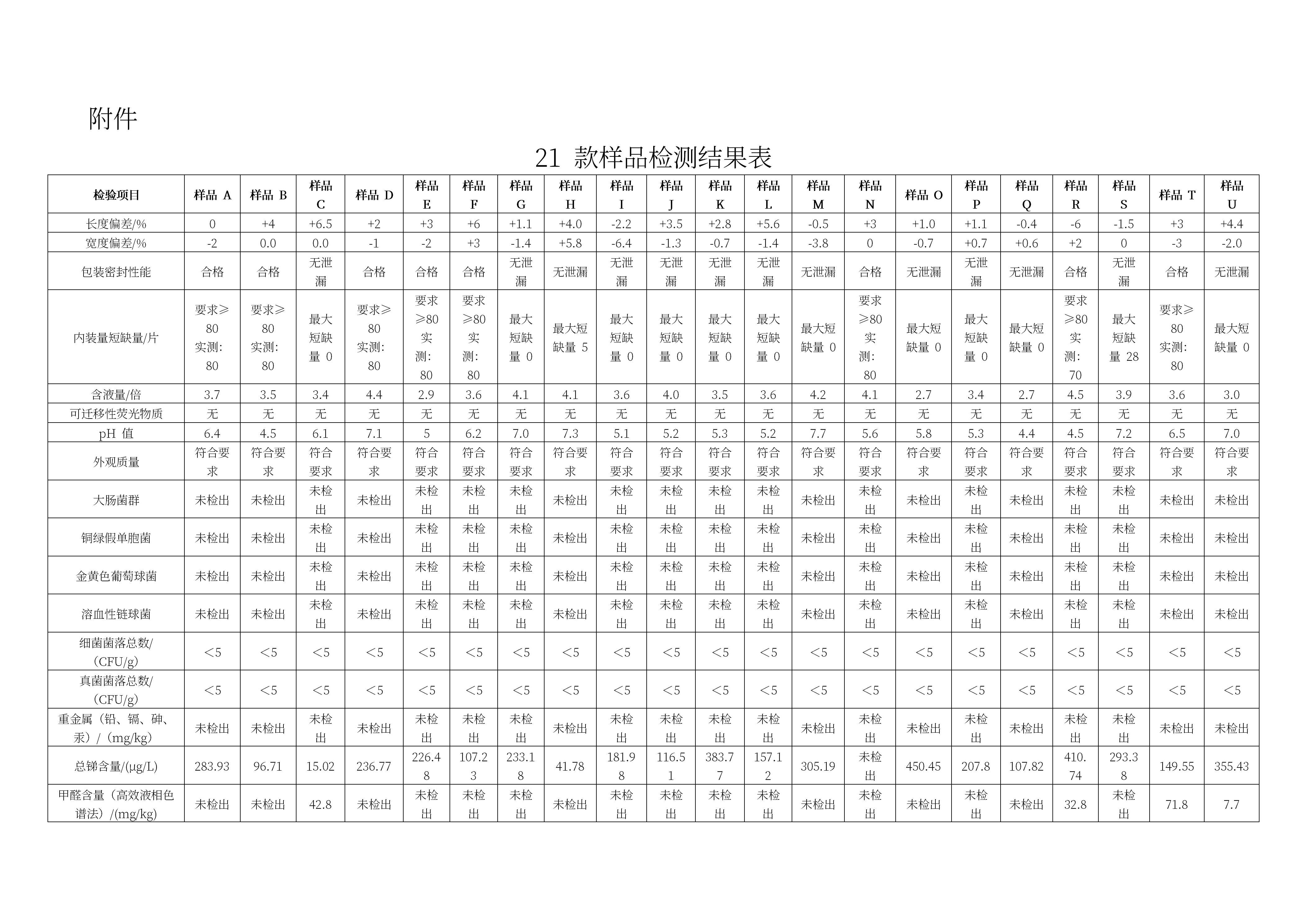 基础性指标方面,包装密封性能全部合格,长度、宽度偏差均在国标允许范围内,含液量均满足≥1.7 倍的国标要求,未出现外观破损、有异物污渍等基础质量问题,但有3款产品的短缺量超出国家标准要求。