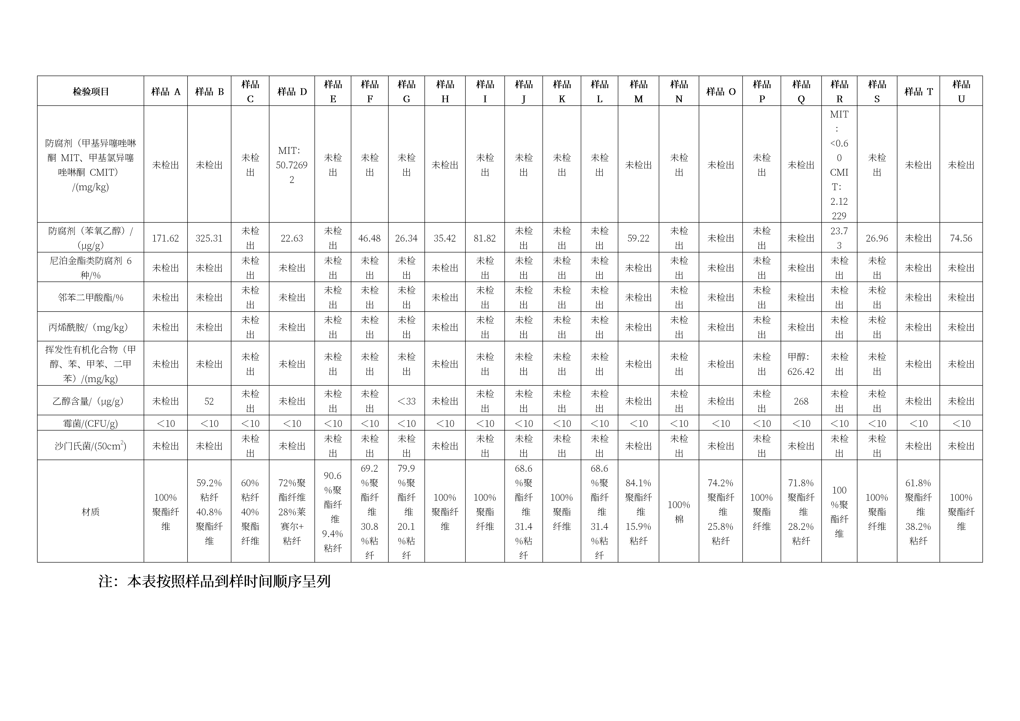 卫生指标方面,所有样品均未检出大肠菌群、铜绿假单胞菌、金黄色葡萄球菌、溶血性链球菌等致病菌,细菌菌落总数、真菌菌落总数均符合国标限值要求,可迁移性荧光物质均未检出。