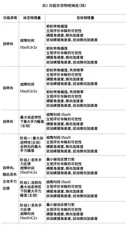 可控性评估按ISO 26262 《道路车辆功能安全》规定进行,等级分为:C0(可控)、C1(简单可控)、C2(一般可控)、C3(难以控制或无法控制)。评估中需将与车辆发生故障时可控性相关的失效模式和驾驶操控进行组合测试。可控性评估应对每个失效模式对应的物理量阈值进行确认[5],具体见表2。