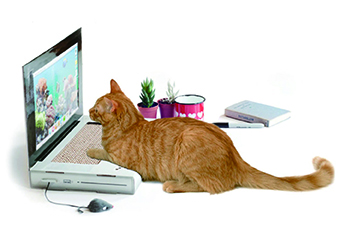 喵星人专用笔记本电脑是一个专为猫咪设计的“电脑”,它具有可更换图片的屏幕和让猫咪肆意磨爪子的擦板。当然,旁边还有一只“鼠标”。