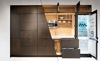 这是Resource Furniture公司推出的一款模块化设计的隐形厨房(Stealth Kitchen),它平时看上去是一面普通的墙,但里面却隐藏了包括炊具、冰箱、冰柜、洗碗机、微波炉、烤箱、水槽和抽油烟机等多种设备,以及丰富的存储空间。你可以根据需要来打开相应的门和厨柜,相应的物品和工具会立刻展现在眼前。