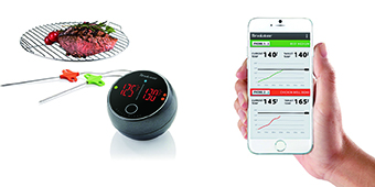 Grill Alert蓝牙温度计是喜欢BBQ新手的福音,它包括一个主体温度仪和两个食物温度探针,可以监测两个食物的煮熟度。它通过蓝牙4.0与智能手机相连,可实现约45米以内对食物的远程监控,当食物烤熟时手机会发出震动提醒;而且就算不再远程监控食物的煮熟度,主体温度仪上也会随时显示食物的温度。