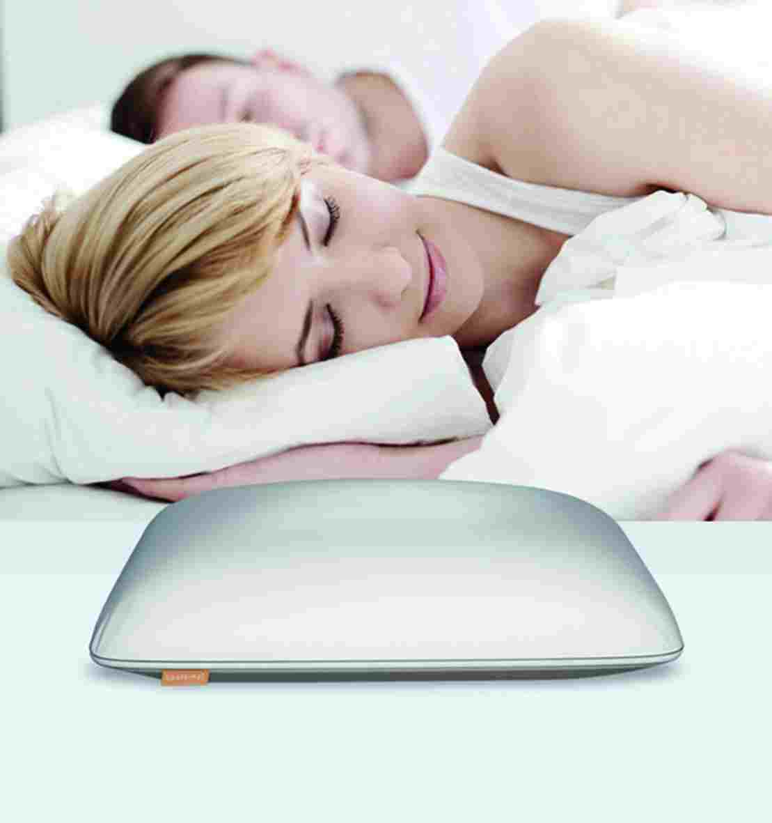 曲到头部的正上方,通过变换颜色、降低亮度、减弱音响、轻微震动来舒缓心率;通过手机APP对其定时,可以模拟太阳升起时的自然光变化来叫醒使用者。同时,它也能模拟日落的光线。