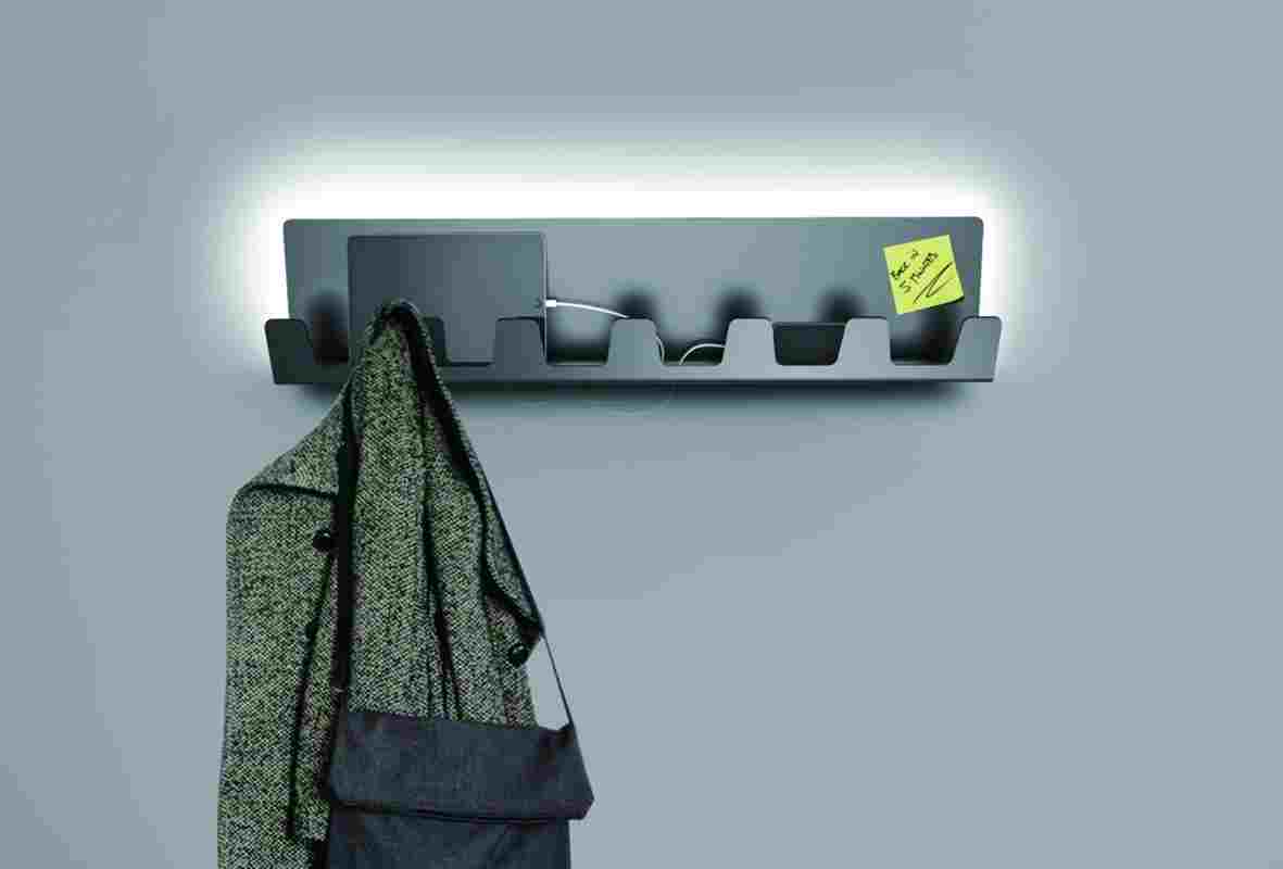 由设计师设计的这款B A N G E RHANGER衣架,在具有衣架的基本功能外,还可以给手机充电。衣架下方有一个小小的开口,能防止数据线杂乱而美观。另外这款简约的金属衣架还具有托盘功能,可以存放钥匙、手机等常用小物品。