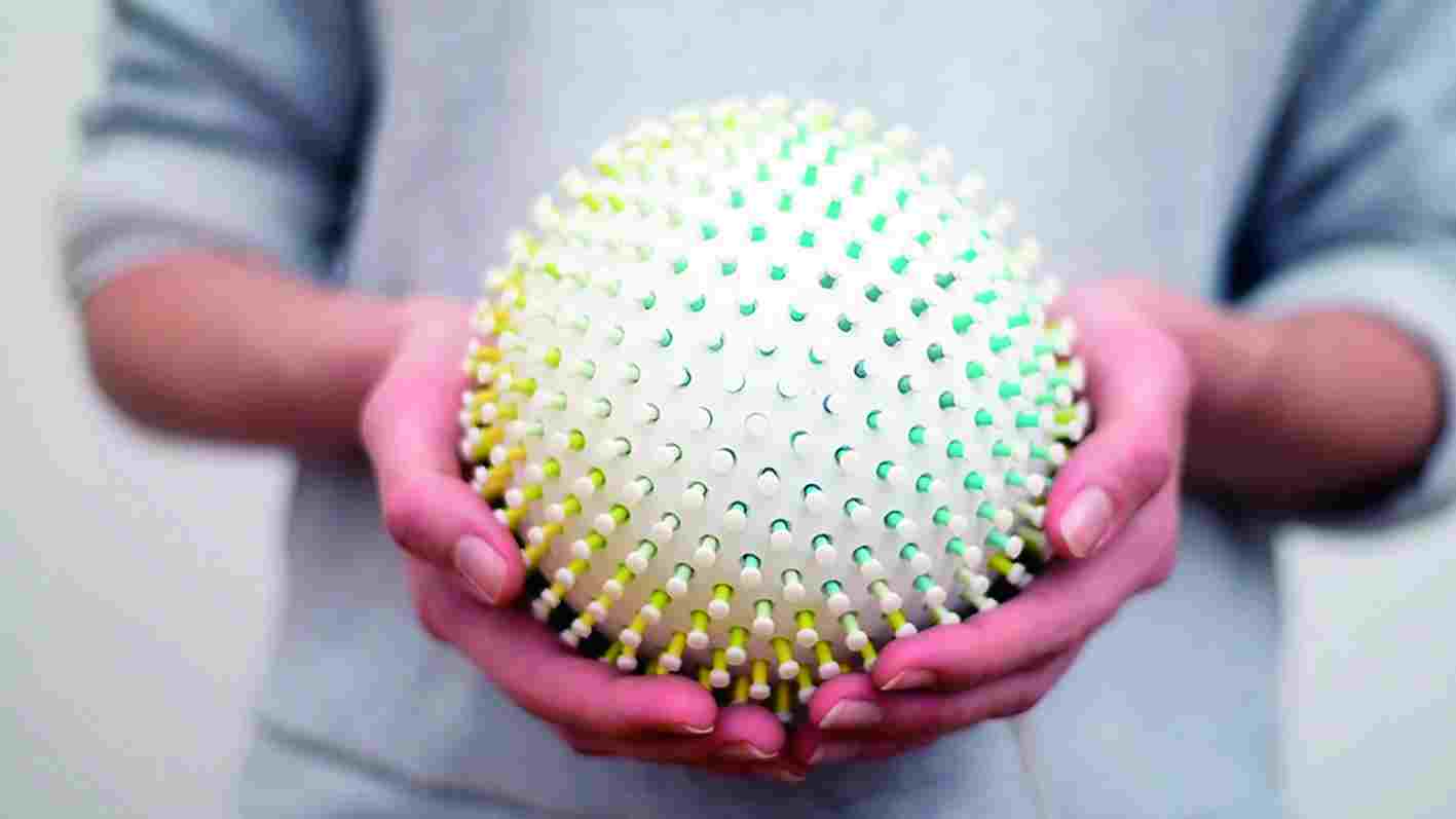 德国界面设计师 simone schramm设计出的交互式样品“stressball(压力测试球)”,通过球表面的外部传感器可以测持球者的皮肤状况,并依此测定压力水平。同时,收集到的数据还会触发球表面变形,在多个凸起同时伸出或缩回的作用下,球体表面会在光滑与凹凸不平之间随时变化。压力测试球表面共有580个触角,均采用3D打印技术制作而成。 每个触角底端均有一根压缩弹簧,压力效果通过球中心内置的气球充气变形后, 将多个触角挤压伸出球体后呈现。