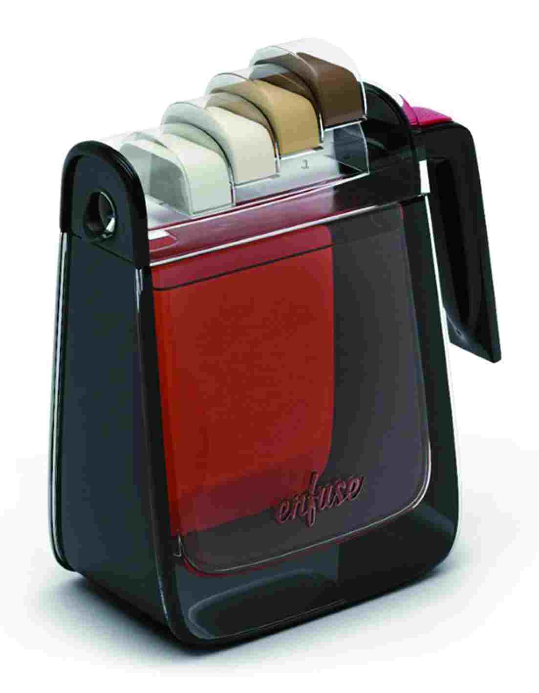 设计师Hussain Almossawi设计的这款多味茶壶Enfuse, 采用扁平化的壶体造型,很有复古味儿。茶壶上部有4个单独的小盒子,可以放置茶叶、花茶、糖或牛奶等。 单独按下小盒子,就会自动放出半勺材料到下部的茶水中,调制出自己喜爱的味道。壶口是闭合的,按下手柄上的按钮可以倒出茶水,方便保温和保味。 透明的材质可以看到内部的液体或材料的变化,增加饮茶的乐趣。