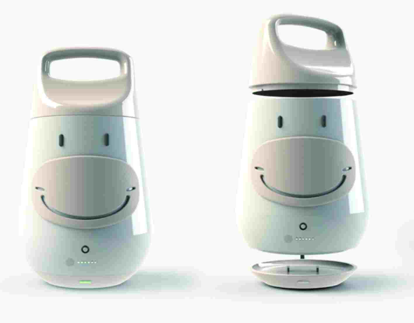 设计师Phornpavee Saiyavath专为儿童设计的便携式哮喘雾化器Nebbie,将吸入器和雾化器合二为一,奶牛头造型不仅能够吸引儿童注意力,还能在他们突发哮喘时起到辅助作用。Nebbie像一个保温杯,由安全塑料和胶制成,内置充电电池,底座有通风口、电量指示灯和充电指示灯,长按橡胶充电按钮可以看到剩余电量。旋转打开活动顶盖,组装好零部件,打开支架固定呼吸管,将存放于储药格中的药粉放入,就可以对宝宝进行雾化治疗。