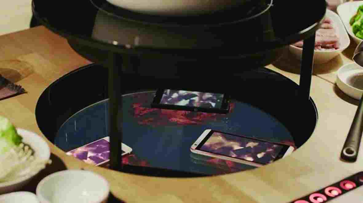 聚会吃饭时,大部分时间人们都在低头玩手机,缺少面对面交流。宜家最近推出的一款专心吃饭餐桌,按一下按键,餐桌中间的电磁炉就会升起来,要让电磁炉工作就必须将手机放在里面。如果要加大火力,就要多放几个手机。